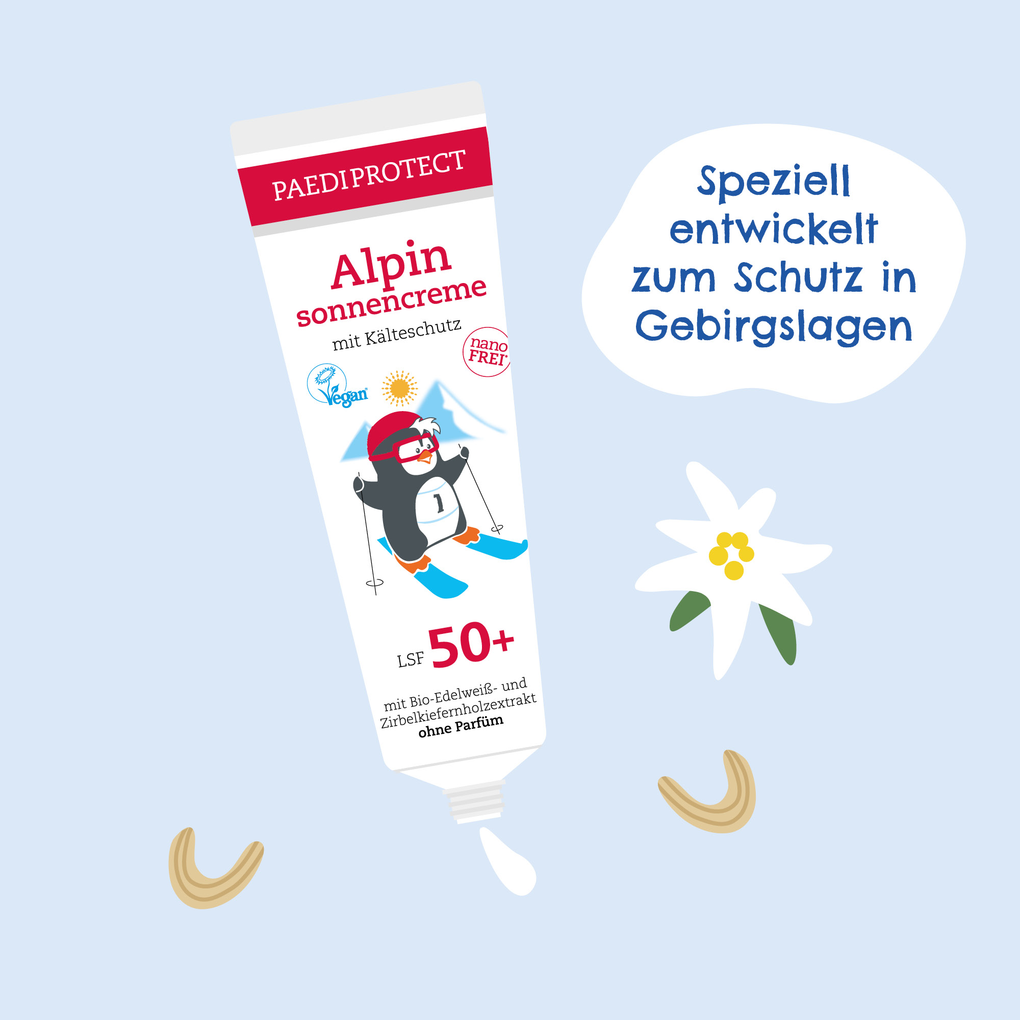 PAEDIPROTECT Alpinsonnencreme ist der ideale Begleiter bei wintersportlichen Aktivitäten. Der kombinierte Schutz vor Sonne und Kälte ist für sensible und empfindliche Haut in alpinen Gebirgslagen entwickelt worden. Bio-Edelweiß- & Zirbelkiefernholzextrakt und Jojobaöl versorgen die Haut mit Vitaminen, pflegen und schützen. Die Hautverträglichkeit ist auch bei hochsensibler Haut dermatologisch bestätigt. Die PAEDIPROTECT Alpinsonnencreme ist daher für die ganze Familie geeignet, auch für empfindliche (Baby-)Haut.