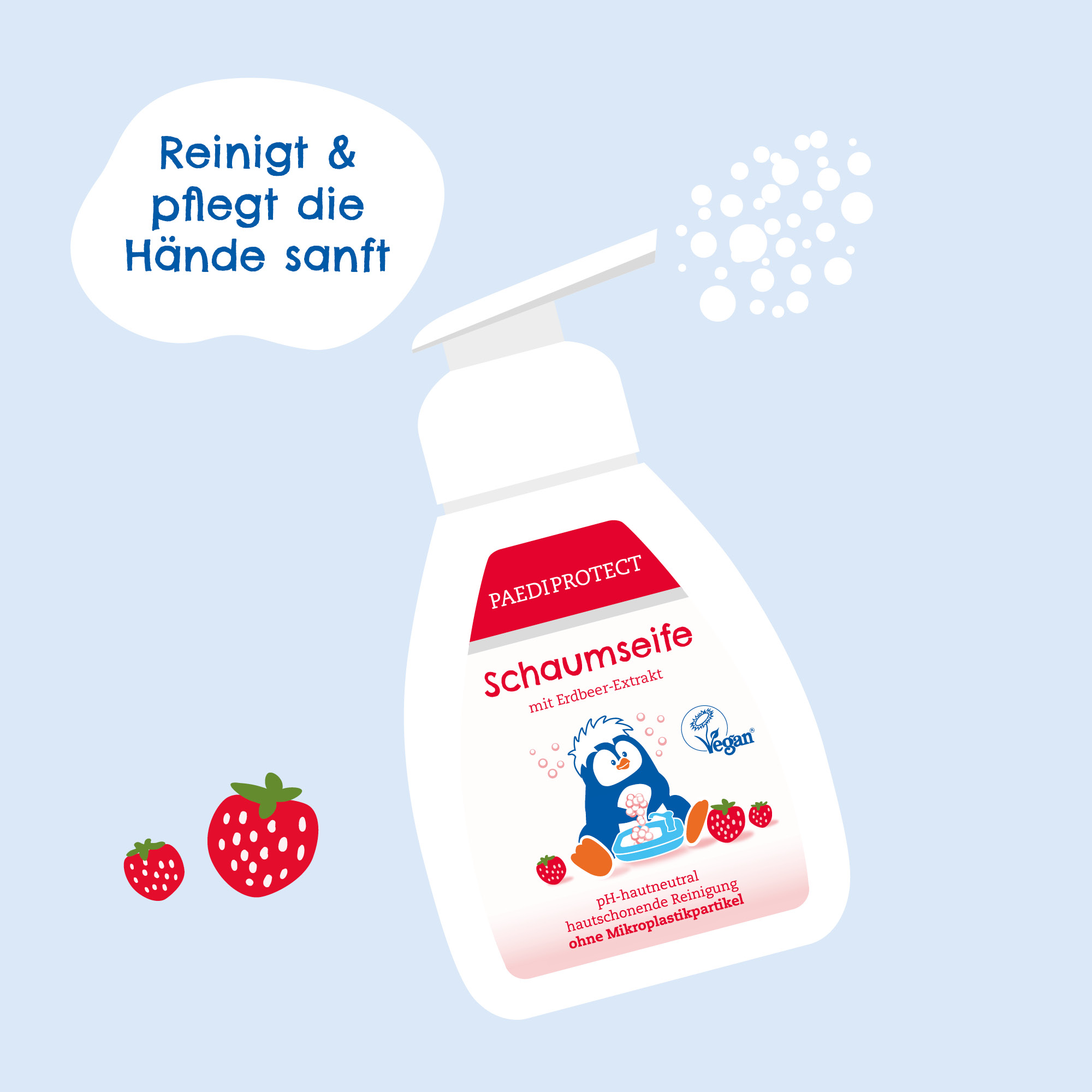 Die vegane Schaumseife mit Erdbeer-Extrakt reinigt die Hände besonders schonend und hygienisch und pflegt die Haut mit Aloe Vera und Glycerin