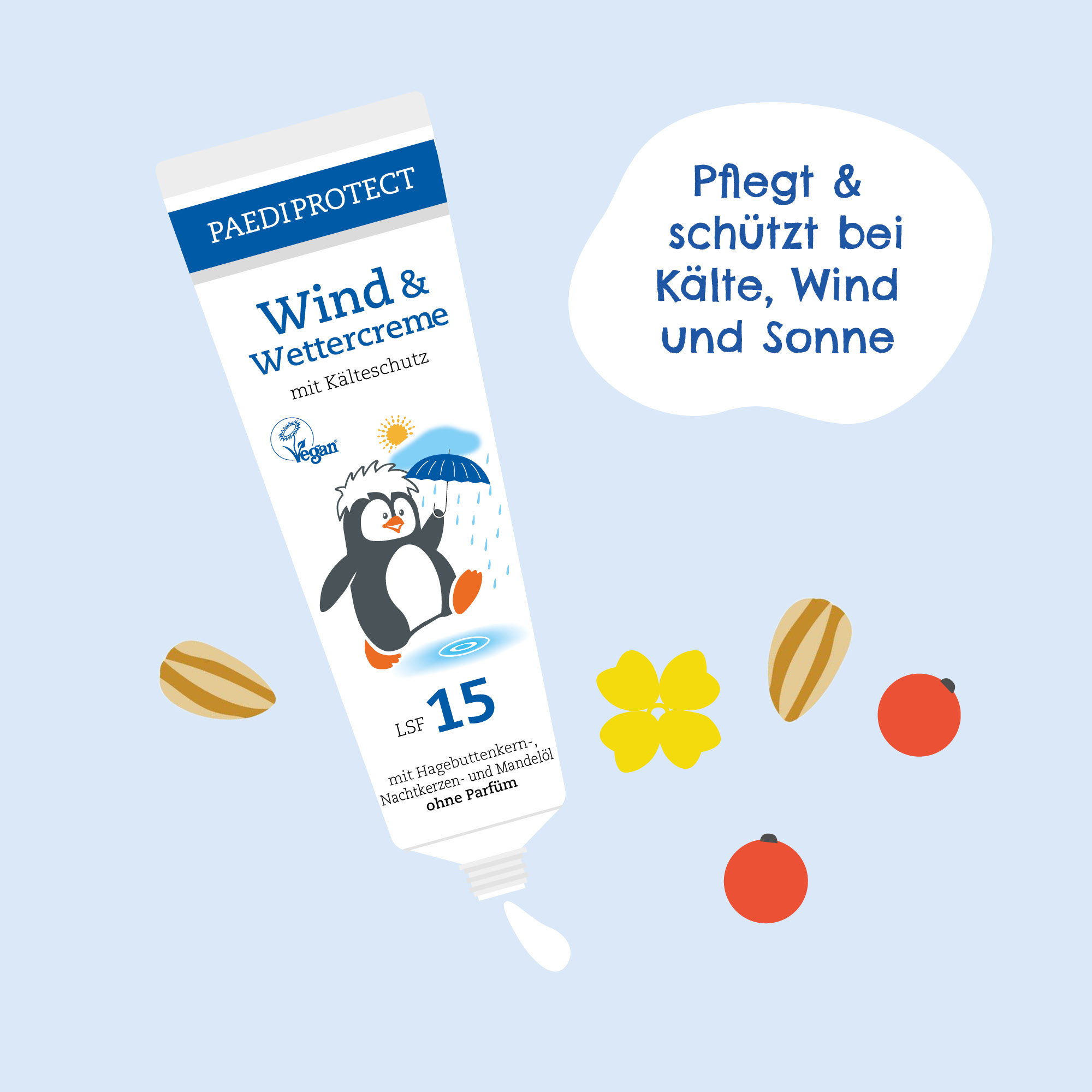 PAEDIPROTECT Wind & Wettercreme pflegt und schützt empfindliche Haut bei Kälte, Wind und Nässe. Die Kombination aus zertifiziertem Kälteschutz und mineralischem UV-Schutz mit LSF 15 macht sie zum idealen Begleiter in der kalten Jahreszeit. Die bewährte Kombination aus Hagebuttenkern-, Nachtkerzen- und Mandelöl nährt intensiv und beruhigt gereizte Hautstellen. Dank sanfter, reizarmer Inhaltsstoffe ist die Wind & Wettercreme für die ganze Familie geeignet, auch für empfindliche und zu Neurodermitis neigende (Baby-)Haut.