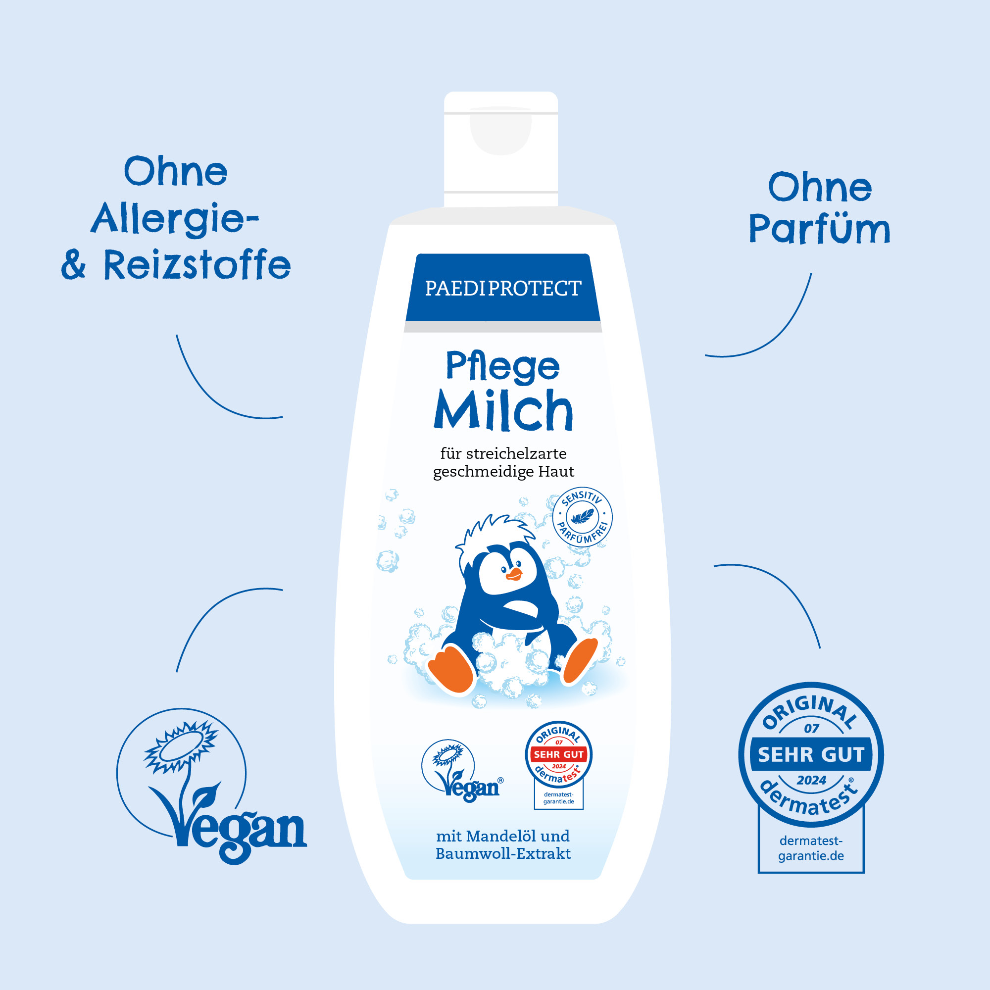 Die PAEDIPROTECT Pflegemilch versorgt empfindliche Haut mit intensiver Feuchtigkeit und schützt sie vor dem Austrocknen.
