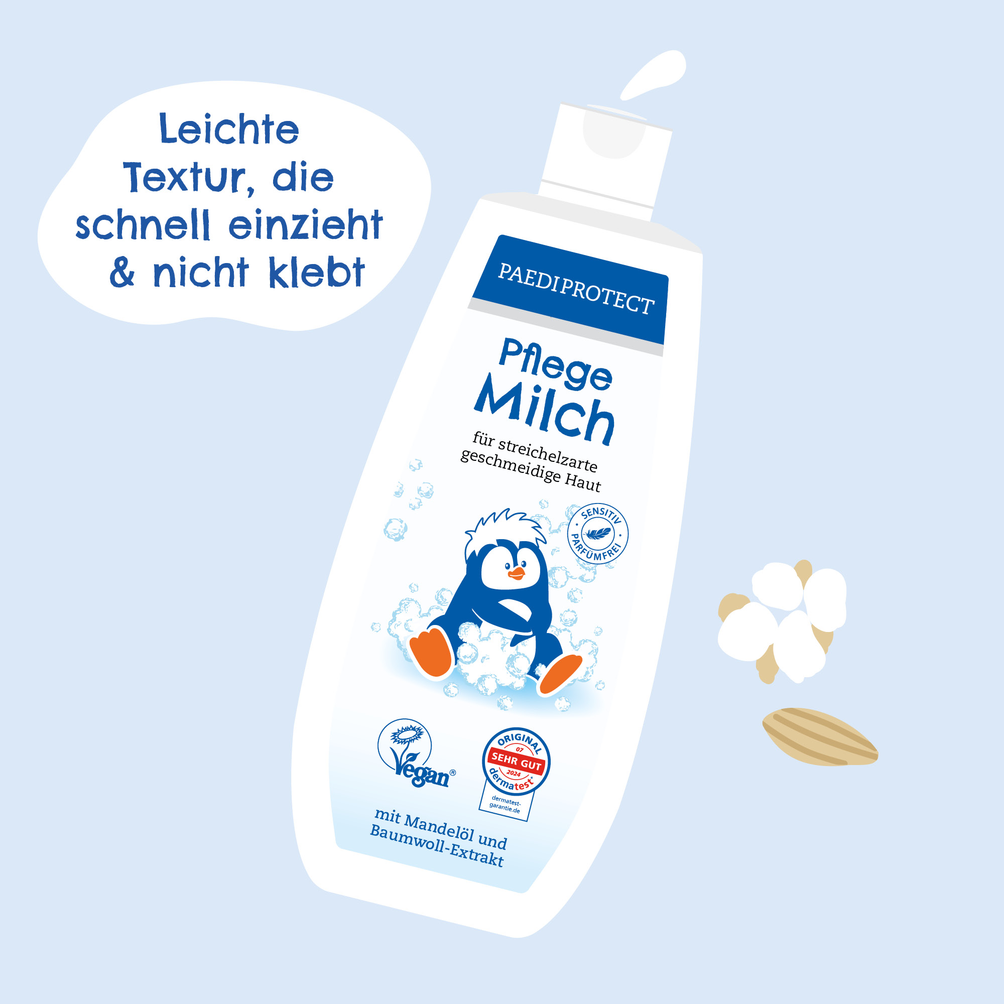 Die leichte, schnell einziehende Textur sorgt für ein zartes und geschmeidiges Hautgefühl, ohne zu kleben. Dank des enthaltenen Baumwoll-Extrakts wird die Haut zusätzlich gepflegt und fühlt sich besonders angenehm an. Ideal für die tägliche Pflege. Mit ihren pflegenden Inhaltsstoffen ist die PAEDIPROTECT Pflegemilch auch perfekt für die ganze Familie geeignet.